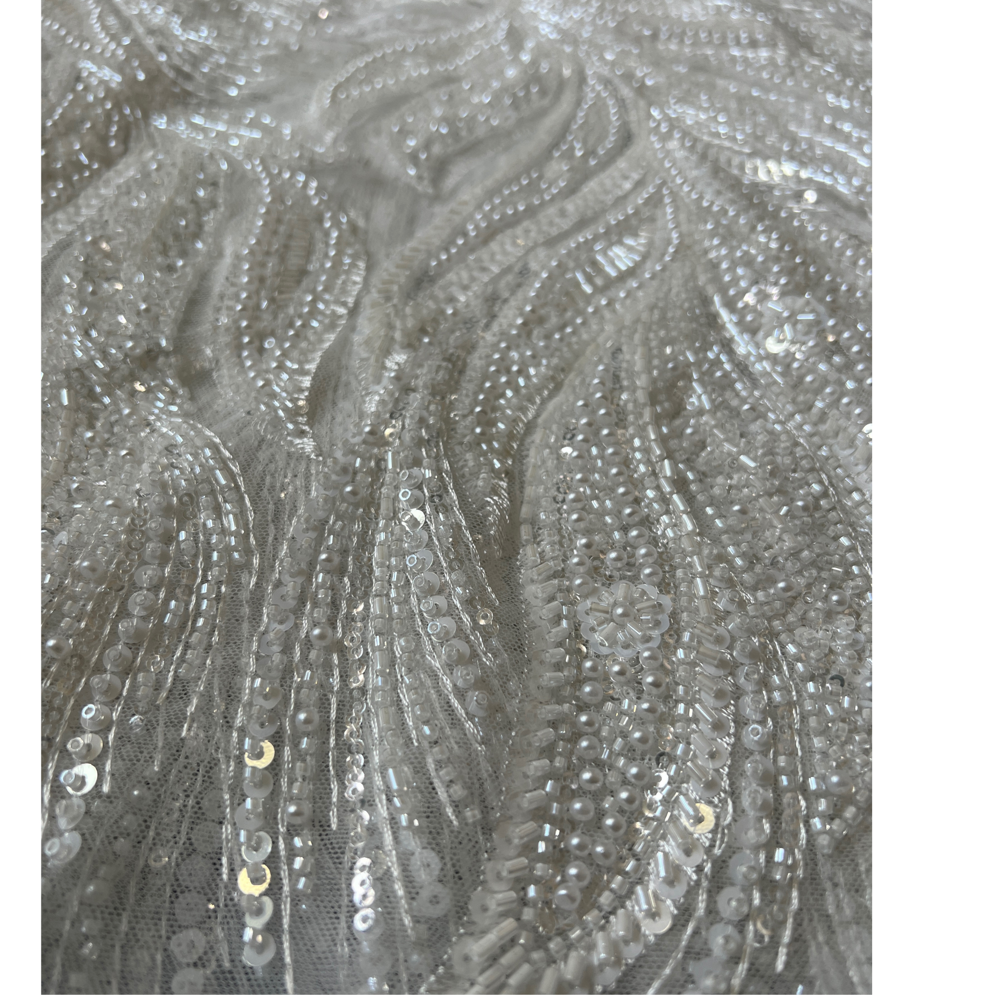 Luxurious off-white beaded lace. Perfect for bespoke gowns, receptions, or couture evening wear. Sold by the yard to bring your designs to life.